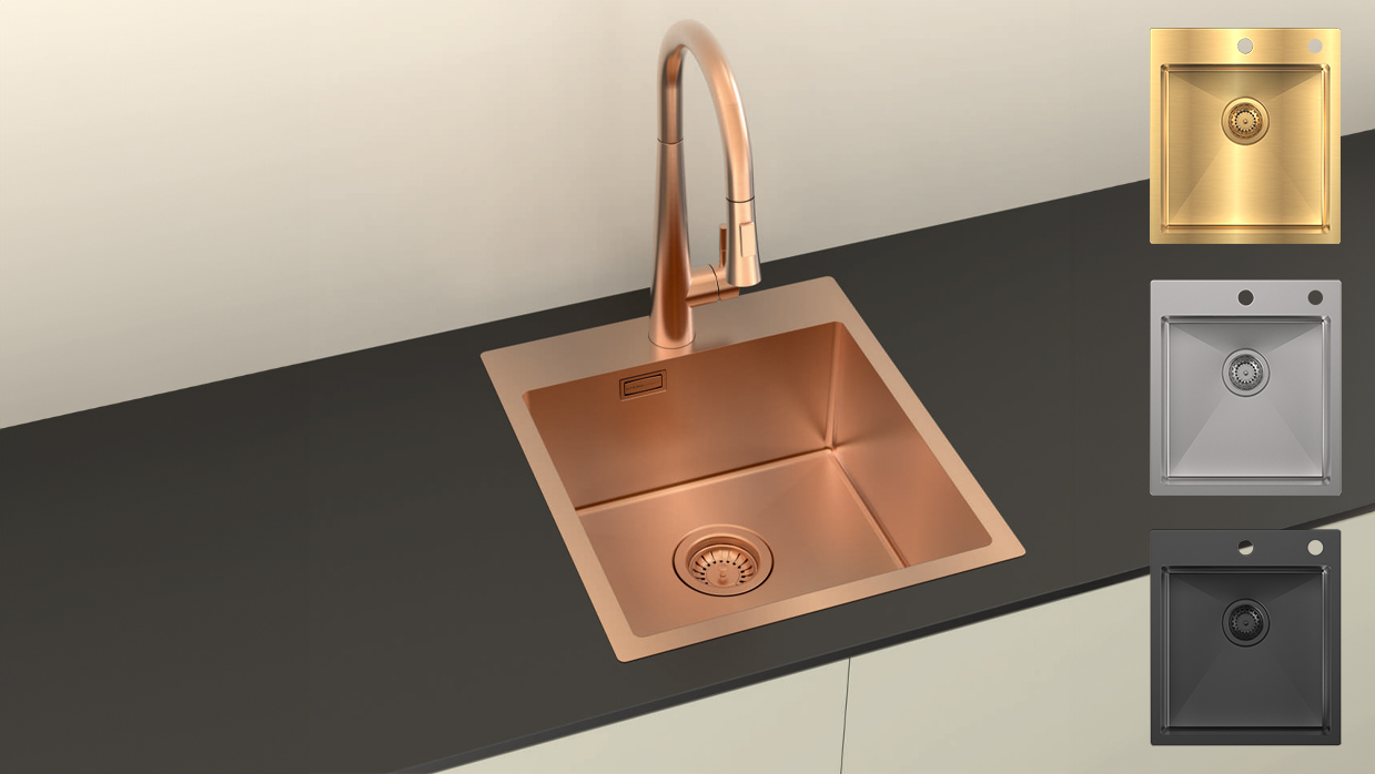 PVD XS – der perfekte Begleiter für Ihre Küche! Mit kompakten Abmessungen von 450 x 510 mm passt diese Spüle ideal in Unterschränke ab 45 cm. Wählen Sie aus vier eleganten Farben – Edelstahl, Gun Metall, Gold und Rose – und setzen Sie stilvolle Akzente in Ihrer Küche.